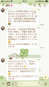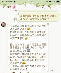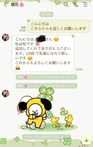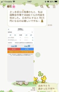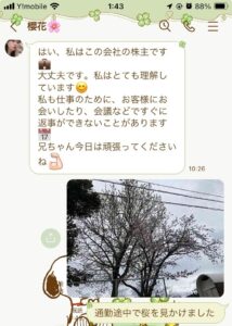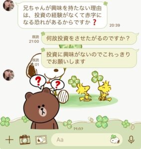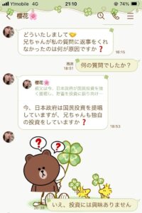 始まりから3日目の火曜日の夜に株で儲かったの話しが出ていよいよかと思って無視していました。翌日水曜日にもその話しが来て興味が無いと答えるとそれっきり連絡が無くなりました。