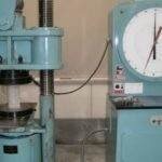 ・コンクリート破壊試験風景です。コンクリートを打つ時に3本体×2採取して現場で品質確認を行い1週間後と4週間後に採取したコンクリート(テストピース)を3本破壊して平均強度を確認します。