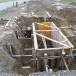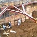 土が運ばれたら、生き埋めにならないように土止めを行いコンクリートを流すための型枠、強度を持たせるために鉄筋を入れます。次に生コンクリート車でコンクリートを打ちます(流し込み)。