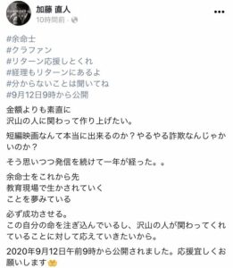 どこまで続けるられるか分かりませんが友達が夢として持っている『未来を創る子供たちに繫げる終活短編映画「余命士」を制作・上映したい』の出来る限りの応援をさせて頂くことにしました。
