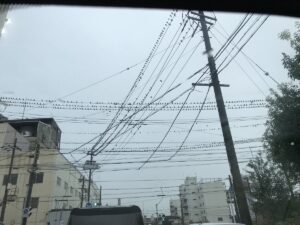 送迎途中に子どもが騒ぐの上を見たら一面の電線にびっしりと鳥(スズメ?!)が止まっていた