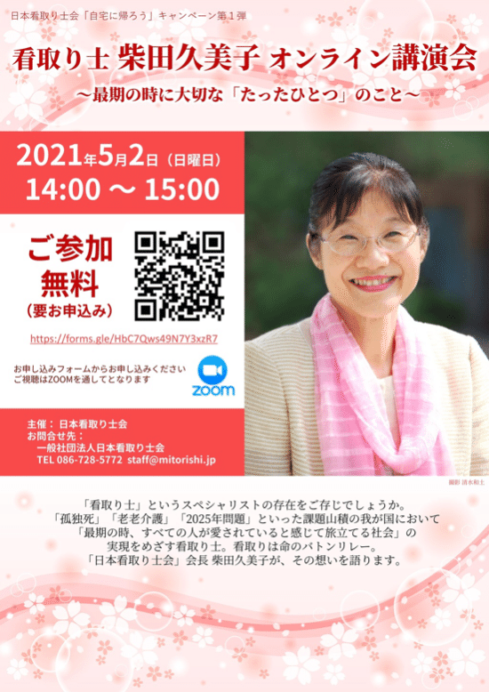 最近の自分の状況から「フッとお迎えが近いのかな?」と思ったりしました。そんな時に看取り学を学んだ看取り士会の無料オンライン講演会を知りオンライン講演会に申し込みました。