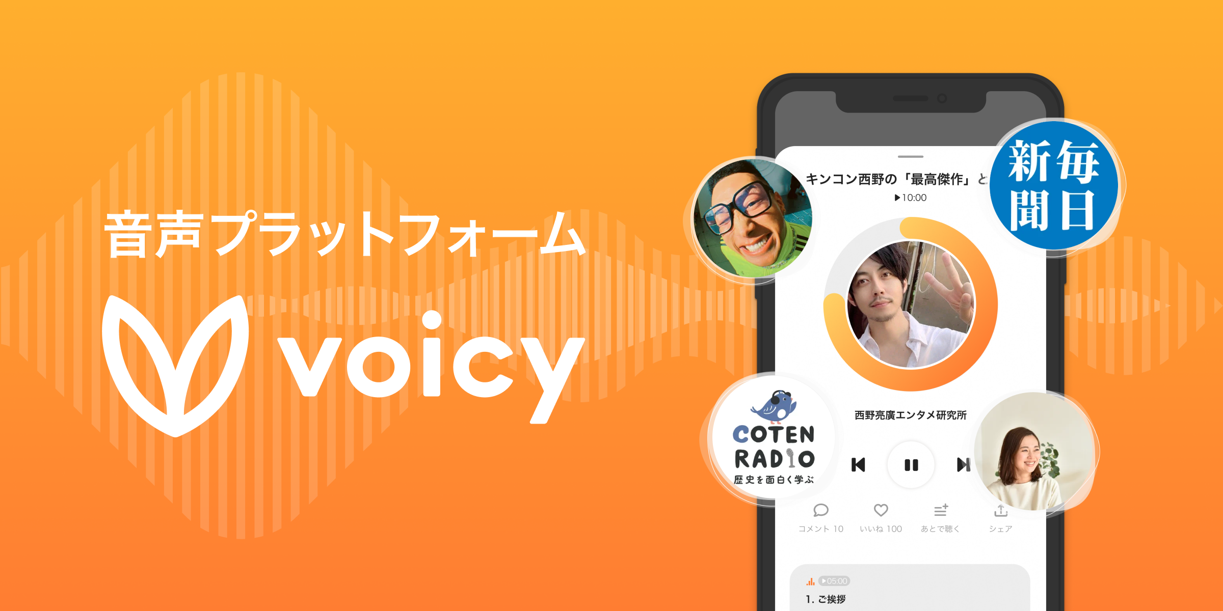 Voicyは、厳選されたコンテンツを"ながら聴き"できる音声の総合プラットフォームです。応募通過率5%の審査を経たパーソナリティの声を中心に、メディアによるニュースや企業の人柄までも伝わるオウンドメディアなど、あらゆる音声放送が楽しめます。