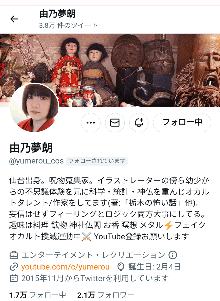 人と出会いは必然とも聞きますがtwitterで「仙台出身の呪物蒐集家 夢郎さん」を知りました。