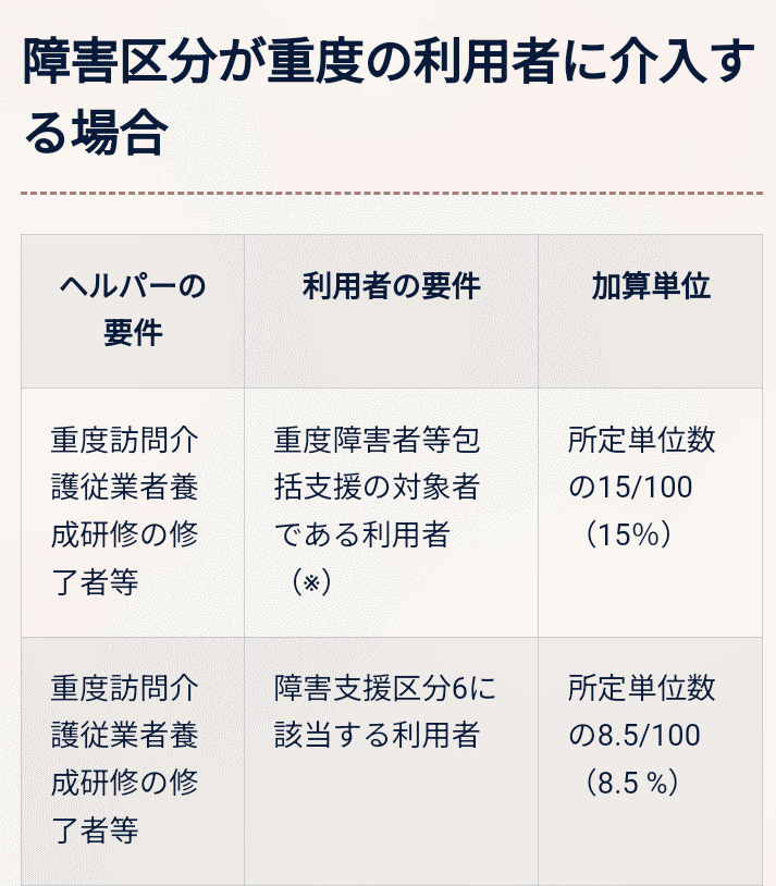 「障がい支援区分」において、4〜6が重度訪問介護の対象者であるのに対し、通常の訪問介護では比較的障がいの軽い区分の方が対象です。